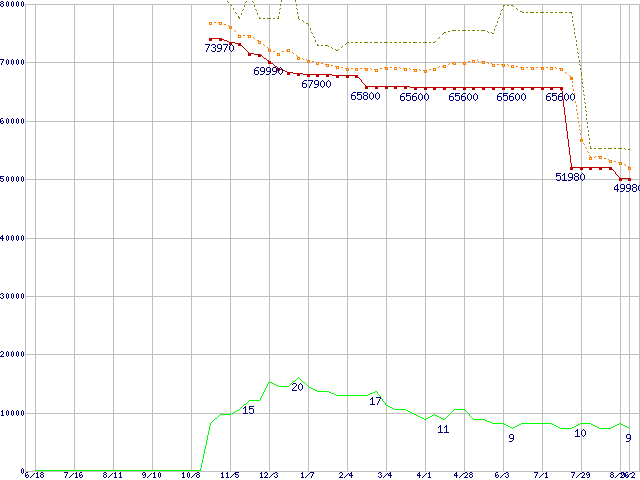※このグラフは過去のデータも税率5%相当に調整した税込み相当額のグラフです。 税率変更や、総額表示方式導入(2004年4月)の影響は除いています。 | | | ●凡例 | 最安値 (点線部は販売店未確認 または未調査) | 平均値 | 最高値 | ショップ数 |