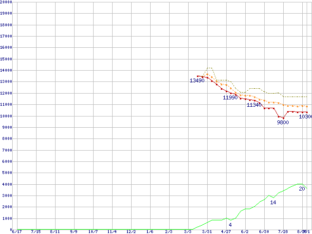 ※このグラフは過去のデータも税率5%相当に調整した税込み相当額のグラフです。 税率変更や、総額表示方式導入(2004年4月)の影響は除いています。 | | | ●凡例 | 最安値 (点線部は販売店未確認 または未調査) | 平均値 | 最高値 | ショップ数 |