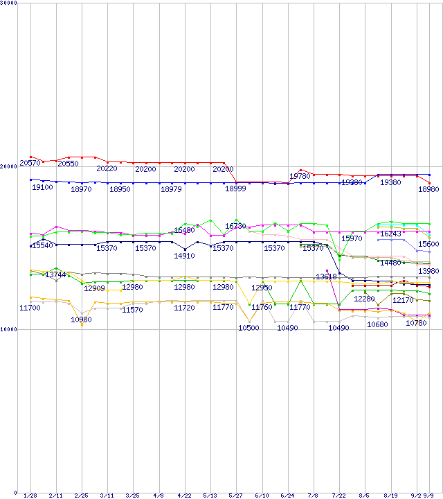 | CPU主要製品(最安値1万円~2万円未満)の最安値推移 | | | (2005年1月28日~2005年9月9日) |