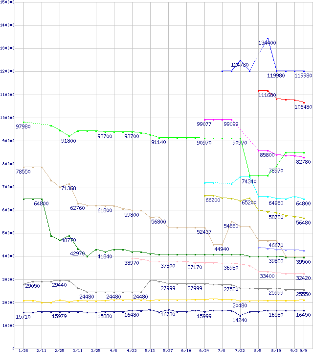 | Socket 939・FSB 1000MHzの最安値推移 | | | (2005年1月28日~2005年9月9日) |