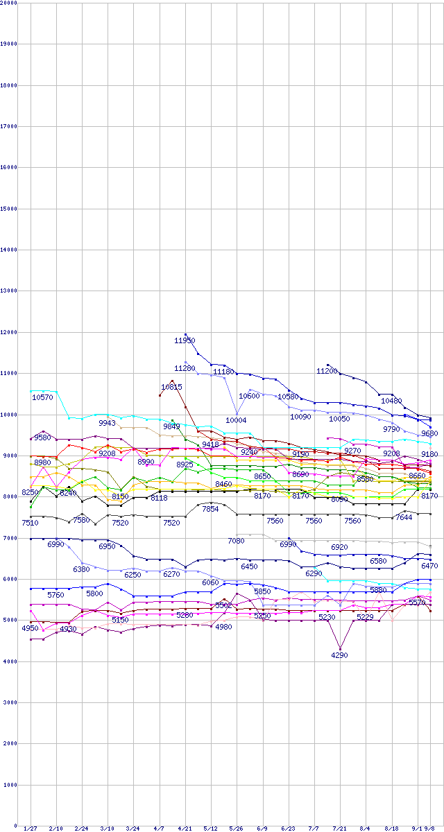 | HDD主要製品(最安値1万円未満)の最安値推移 | | | (2005年1月27日~2005年9月8日) |