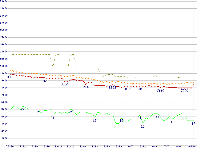 ※このグラフは過去のデータも税率5%相当に調整した税込み相当額のグラフです。 税率変更や、総額表示方式導入(2004年4月)の影響は除いています。 | | | ●凡例 | 最安値 (点線部は販売店未確認 または未調査) | 平均値 | 最高値 | ショップ数 |