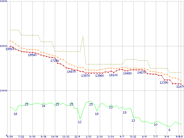 ※このグラフは過去のデータも税率5%相当に調整した税込み相当額のグラフです。 税率変更や、総額表示方式導入(2004年4月)の影響は除いています。 | | | ●凡例 | 最安値 (点線部は販売店未確認 または未調査) | 平均値 | 最高値 | ショップ数 |