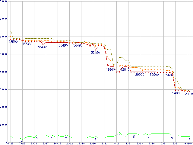 ※このグラフは過去のデータも税率5%相当に調整した税込み相当額のグラフです。 税率変更や、総額表示方式導入(2004年4月)の影響は除いています。 | | | ●凡例 | 最安値 (点線部は販売店未確認 または未調査) | 平均値 | 最高値 | ショップ数 |