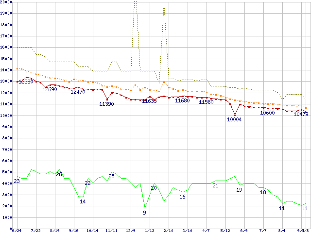 ※このグラフは過去のデータも税率5%相当に調整した税込み相当額のグラフです。 税率変更や、総額表示方式導入(2004年4月)の影響は除いています。 | | | ●凡例 | 最安値 (点線部は販売店未確認 または未調査) | 平均値 | 最高値 | ショップ数 |