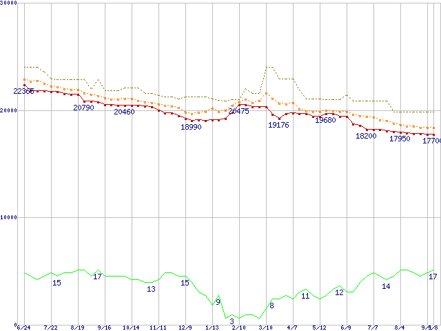 | WD740GD (74.3GB)の価格推移 | | | (2004年6月24日~2005年9月8日) |
