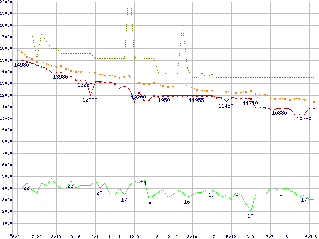 ※このグラフは過去のデータも税率5%相当に調整した税込み相当額のグラフです。 税率変更や、総額表示方式導入(2004年4月)の影響は除いています。 | | | ●凡例 | 最安値 (点線部は販売店未確認 または未調査) | 平均値 | 最高値 | ショップ数 |