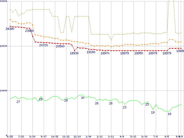 ※このグラフは過去のデータも税率5%相当に調整した税込み相当額のグラフです。 税率変更や、総額表示方式導入(2004年4月)の影響は除いています。 | | | ●凡例 | 最安値 (点線部は販売店未確認 または未調査) | 平均値 | 最高値 | ショップ数 |