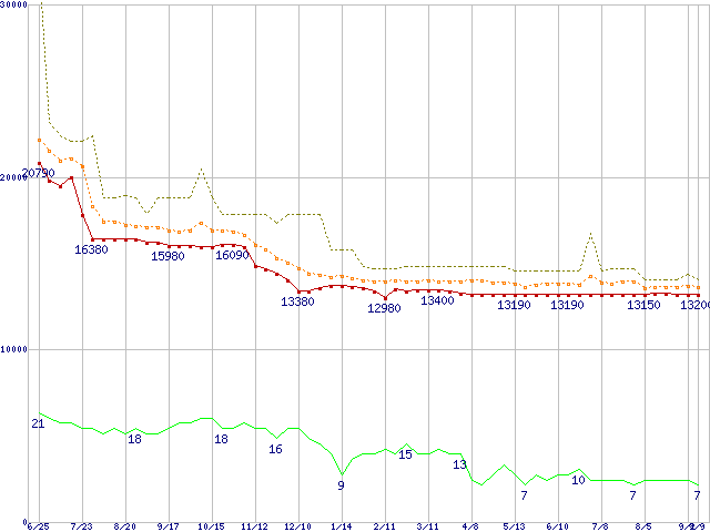 ※このグラフは過去のデータも税率5%相当に調整した税込み相当額のグラフです。 税率変更や、総額表示方式導入(2004年4月)の影響は除いています。 | | | ●凡例 | 最安値 (点線部は販売店未確認 または未調査) | 平均値 | 最高値 | ショップ数 |