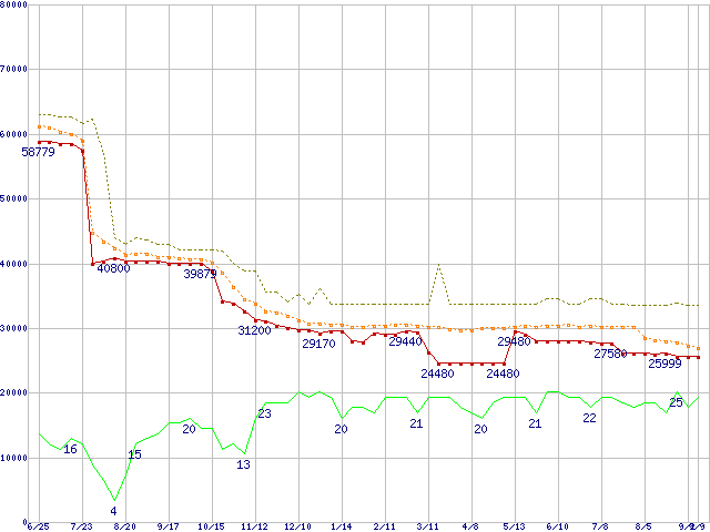 | Athlon 64 3500+ (2.2GHz,L2 512KB)の価格推移 | | | (2004年6月25日~2005年9月9日) |