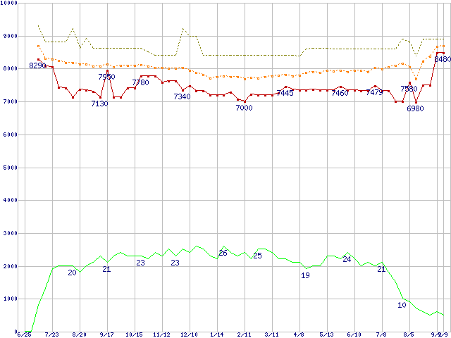 ※このグラフは過去のデータも税率5%相当に調整した税込み相当額のグラフです。 税率変更や、総額表示方式導入(2004年4月)の影響は除いています。 | | | ●凡例 | 最安値 (点線部は販売店未確認 または未調査) | 平均値 | 最高値 | ショップ数 |