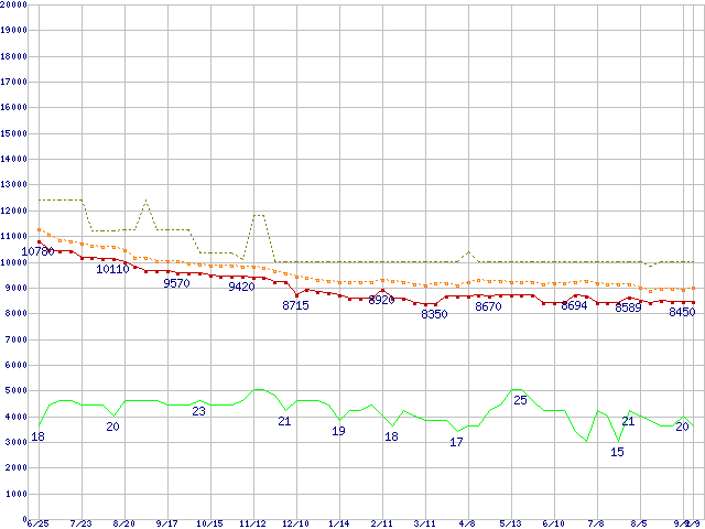 ※このグラフは過去のデータも税率5%相当に調整した税込み相当額のグラフです。 税率変更や、総額表示方式導入(2004年4月)の影響は除いています。 | | | ●凡例 | 最安値 (点線部は販売店未確認 または未調査) | 平均値 | 最高値 | ショップ数 |
