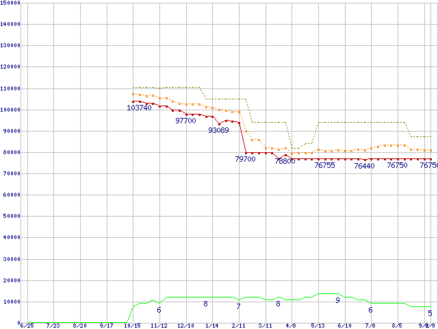 ※このグラフは過去のデータも税率5%相当に調整した税込み相当額のグラフです。 税率変更や、総額表示方式導入(2004年4月)の影響は除いています。 | | | ●凡例 | 最安値 (点線部は販売店未確認 または未調査) | 平均値 | 最高値 | ショップ数 |