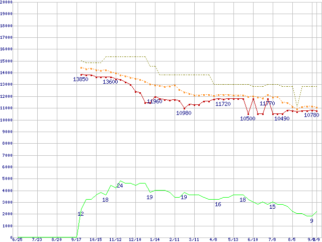 ※このグラフは過去のデータも税率5%相当に調整した税込み相当額のグラフです。 税率変更や、総額表示方式導入(2004年4月)の影響は除いています。 | | | ●凡例 | 最安値 (点線部は販売店未確認 または未調査) | 平均値 | 最高値 | ショップ数 |