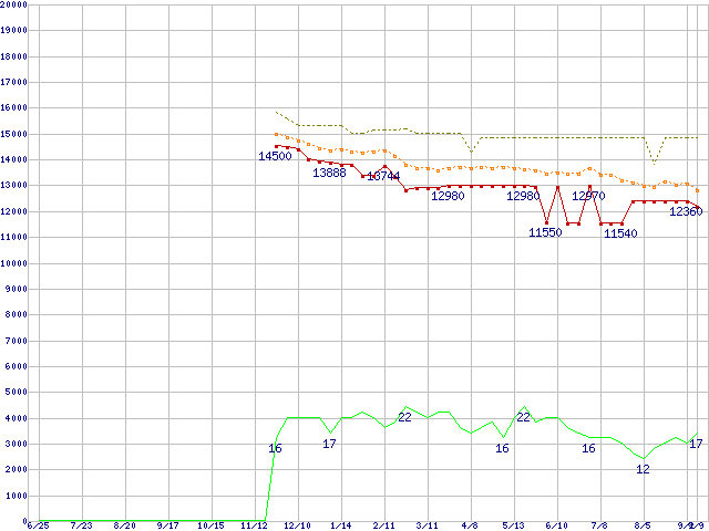 ※このグラフは過去のデータも税率5%相当に調整した税込み相当額のグラフです。 税率変更や、総額表示方式導入(2004年4月)の影響は除いています。 | | | ●凡例 | 最安値 (点線部は販売店未確認 または未調査) | 平均値 | 最高値 | ショップ数 |