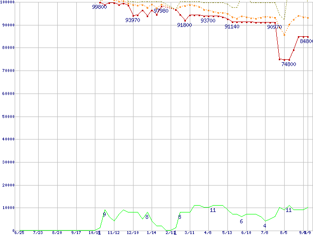 | Athlon 64 FX-55 (2.6GHz)の価格推移 | | | (2004年6月25日~2005年9月9日) |
