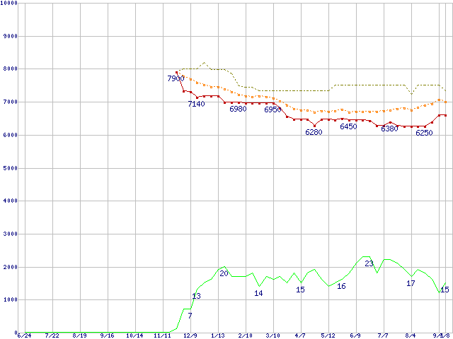 ※このグラフは過去のデータも税率5%相当に調整した税込み相当額のグラフです。 税率変更や、総額表示方式導入(2004年4月)の影響は除いています。 | | | ●凡例 | 最安値 (点線部は販売店未確認 または未調査) | 平均値 | 最高値 | ショップ数 |