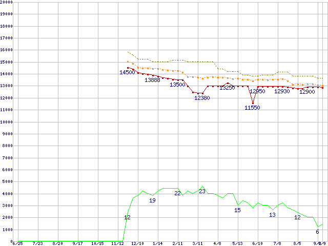 ※このグラフは過去のデータも税率5%相当に調整した税込み相当額のグラフです。 税率変更や、総額表示方式導入(2004年4月)の影響は除いています。 | | | ●凡例 | 最安値 (点線部は販売店未確認 または未調査) | 平均値 | 最高値 | ショップ数 |