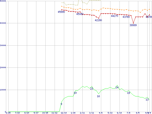 ※このグラフは過去のデータも税率5%相当に調整した税込み相当額のグラフです。 税率変更や、総額表示方式導入(2004年4月)の影響は除いています。 | | | ●凡例 | 最安値 (点線部は販売店未確認 または未調査) | 平均値 | 最高値 | ショップ数 |