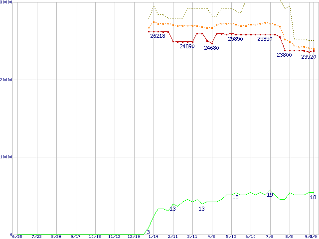 ※このグラフは過去のデータも税率5%相当に調整した税込み相当額のグラフです。 税率変更や、総額表示方式導入(2004年4月)の影響は除いています。 | | | ●凡例 | 最安値 (点線部は販売店未確認 または未調査) | 平均値 | 最高値 | ショップ数 |