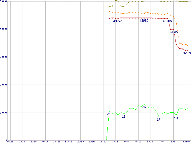 ※このグラフは過去のデータも税率5%相当に調整した税込み相当額のグラフです。 税率変更や、総額表示方式導入(2004年4月)の影響は除いています。 | | | ●凡例 | 最安値 (点線部は販売店未確認 または未調査) | 平均値 | 最高値 | ショップ数 |