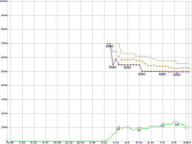 ※このグラフは過去のデータも税率5%相当に調整した税込み相当額のグラフです。 税率変更や、総額表示方式導入(2004年4月)の影響は除いています。 | | | ●凡例 | 最安値 (点線部は販売店未確認 または未調査) | 平均値 | 最高値 | ショップ数 |