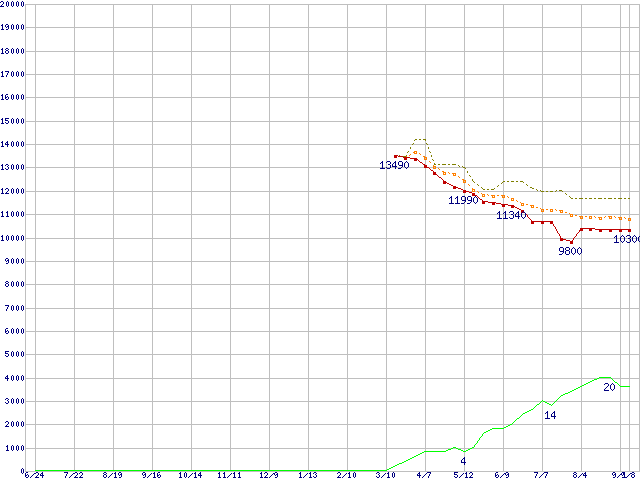 ※このグラフは過去のデータも税率5%相当に調整した税込み相当額のグラフです。 税率変更や、総額表示方式導入(2004年4月)の影響は除いています。 | | | ●凡例 | 最安値 (点線部は販売店未確認 または未調査) | 平均値 | 最高値 | ショップ数 |