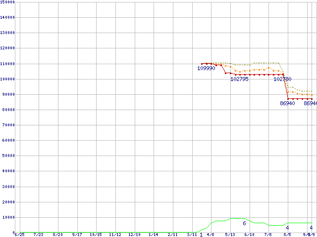※このグラフは過去のデータも税率5%相当に調整した税込み相当額のグラフです。 税率変更や、総額表示方式導入(2004年4月)の影響は除いています。 | | | ●凡例 | 最安値 (点線部は販売店未確認 または未調査) | 平均値 | 最高値 | ショップ数 |