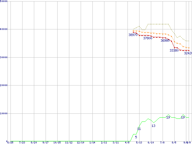 | Athlon 64 3700+ (2.2GHz,L2 1MB)の価格推移 | | | (2004年6月25日~2005年9月9日) |
