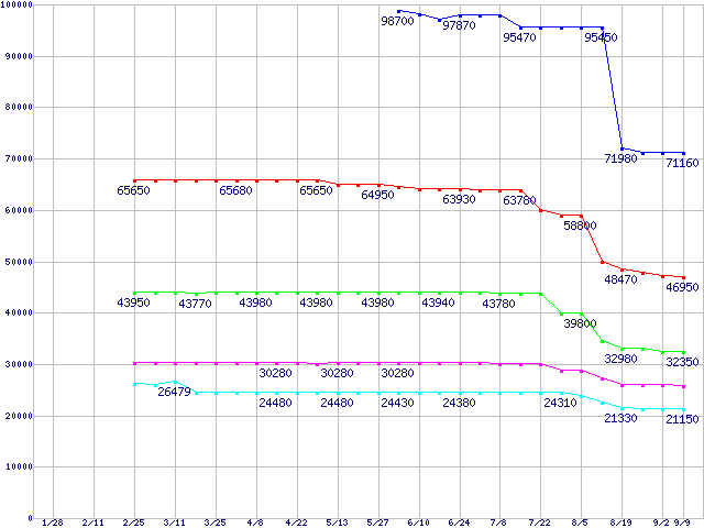 | LGA 775 (FSB 800MHz,L2 2MB,Hyper-Threading,EM64T・NX bit対応)の最安値推移 | | | (2005年1月28日~2005年9月9日) |