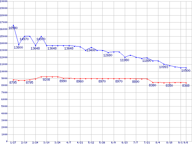 | WD Caviar[Special Edition] (7200rpm,Ultra ATA/100,8MB)の最安値推移 | | | (2005年1月27日~2005年9月8日) |