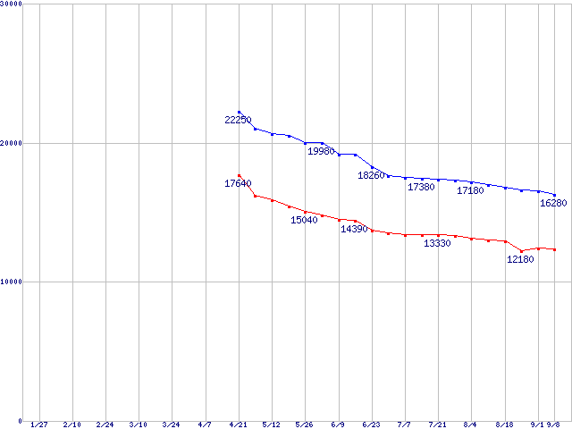 | MaXLine III (7200rpm,16MB,Serial ATA II Phase1,RoHS指令準拠)の最安値推移 | | | (2005年1月27日~2005年9月8日) |
