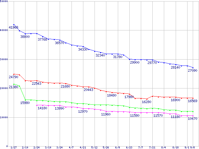 | Barracuda 7200.8 SATA (7200rpm,Serial ATA,NCQ,8MB,133GB/Platter)の最安値推移 | | | (2005年1月27日~2005年9月8日) |