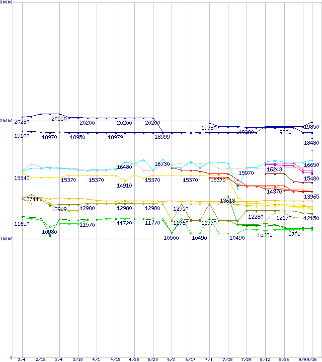 | CPU主要製品(最安値1万円~2万円未満)の最安値推移 | | | (2005年2月4日~2005年9月16日) |