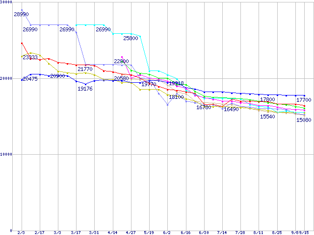 HDD主要製品(最安値1万5千円~2万円未満)の最安値推移