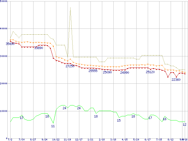 ※このグラフは過去のデータも税率5%相当に調整した税込み相当額のグラフです。 税率変更や、総額表示方式導入(2004年4月)の影響は除いています。 | | | ●凡例 | 最安値 (点線部は販売店未確認 または未調査) | 平均値 | 最高値 | ショップ数 |