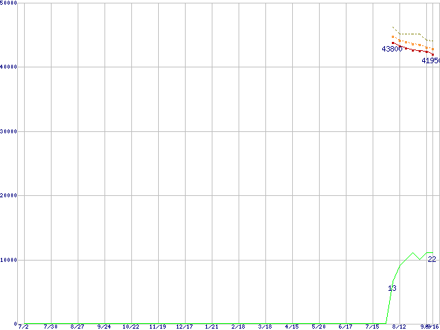 ※このグラフは過去のデータも税率5%相当に調整した税込み相当額のグラフです。 税率変更や、総額表示方式導入(2004年4月)の影響は除いています。 | | | ●凡例 | 最安値 (点線部は販売店未確認 または未調査) | 平均値 | 最高値 | ショップ数 |