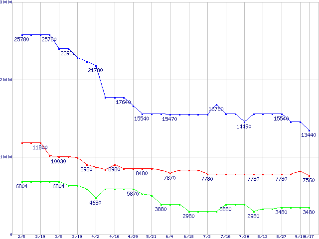 PC3200(DDR400) DDR SDRAM DIMMの最安値推移