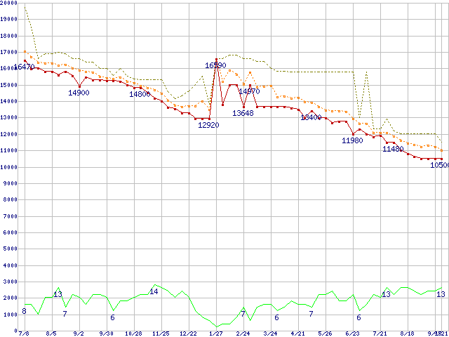 ※このグラフは過去のデータも税率5%相当に調整した税込み相当額のグラフです。 税率変更や、総額表示方式導入(2004年4月)の影響は除いています。 | | | ●凡例 | 最安値 (点線部は販売店未確認 または未調査) | 平均値 | 最高値 | ショップ数 |
