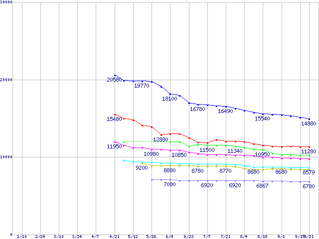 | DiamondMax 10 (7200rpm,Serial ATA II Phase1,RoHS指令準拠)の最安値推移 | | | (2005年2月10日~2005年9月21日) |