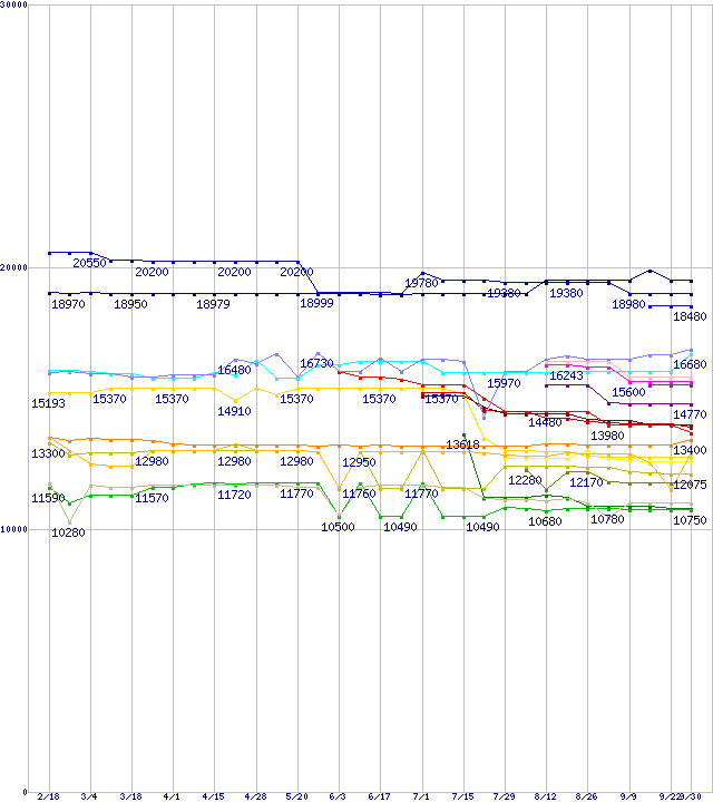 | CPU主要製品(最安値1万円~2万円未満)の最安値推移 | | | (2005年2月18日~2005年9月30日) |