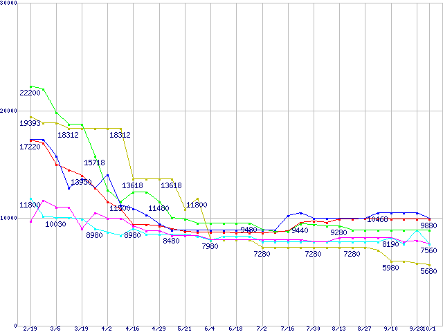 メモリ主要製品(最安値5千円~1万円未満)の最安値推移