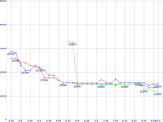 メモリ主要製品(最安値1万円以上)の最安値推移