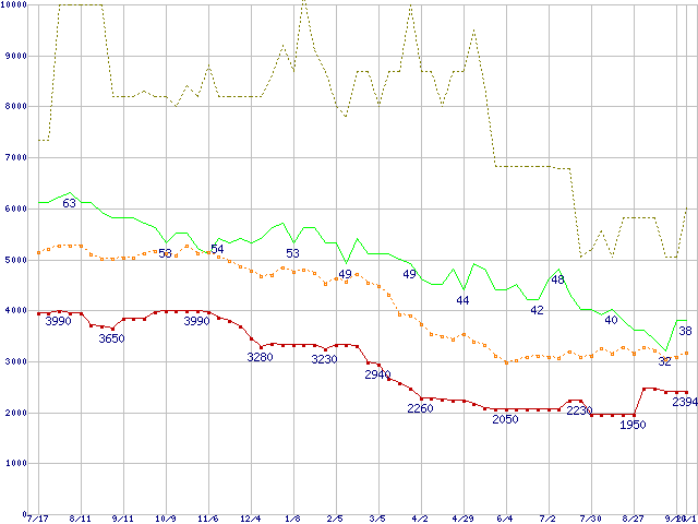 ※このグラフは過去のデータも税率5%相当に調整した税込み相当額のグラフです。 税率変更や、総額表示方式導入(2004年4月)の影響は除いています。 | | | ●凡例 | 最安値 (点線部は販売店未確認 または未調査) | 平均値 | 最高値 | ショップ数 |