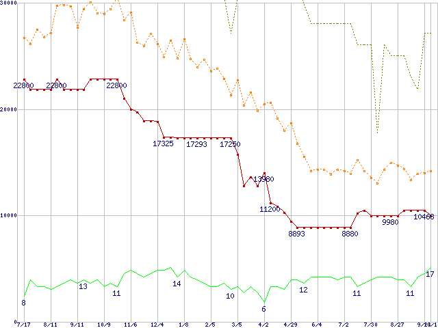 ※このグラフは過去のデータも税率5%相当に調整した税込み相当額のグラフです。 税率変更や、総額表示方式導入(2004年4月)の影響は除いています。 | | | ●凡例 | 最安値 (点線部は販売店未確認 または未調査) | 平均値 | 最高値 | ショップ数 |