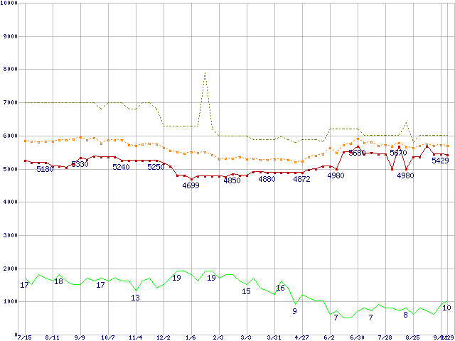 ※このグラフは過去のデータも税率5%相当に調整した税込み相当額のグラフです。 税率変更や、総額表示方式導入(2004年4月)の影響は除いています。 | | | ●凡例 | 最安値 (点線部は販売店未確認 または未調査) | 平均値 | 最高値 | ショップ数 |