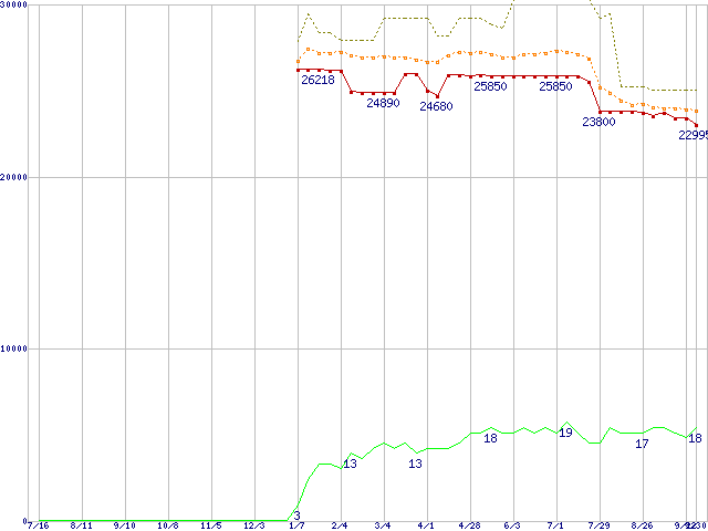 ※このグラフは過去のデータも税率5%相当に調整した税込み相当額のグラフです。 税率変更や、総額表示方式導入(2004年4月)の影響は除いています。 | | | ●凡例 | 最安値 (点線部は販売店未確認 または未調査) | 平均値 | 最高値 | ショップ数 |