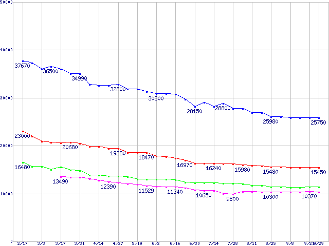 | Barracuda 7200.8 (7200rpm,Ultra ATA/100,8MB,133GB/Platter)の最安値推移 | | | (2005年2月17日~2005年9月29日) |
