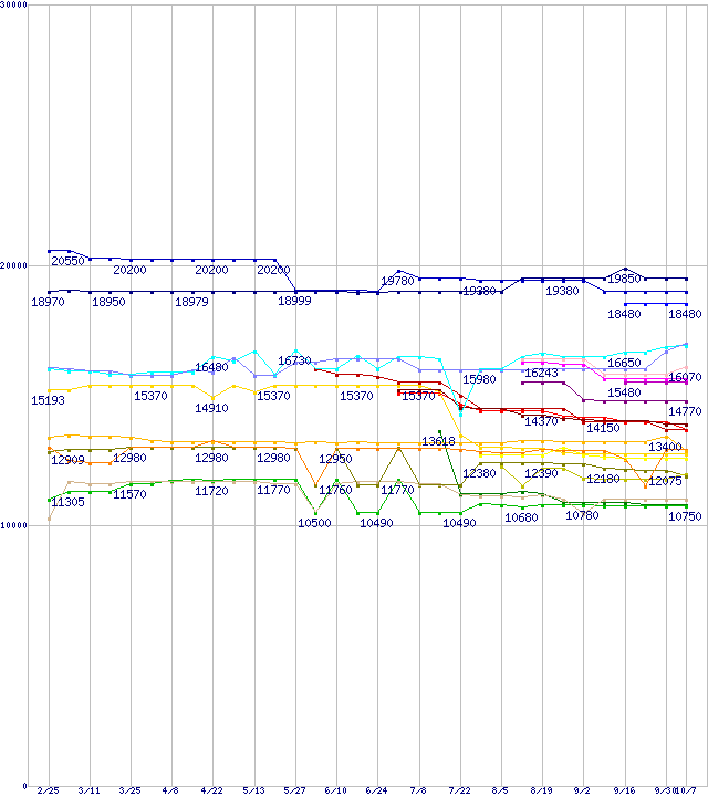 | CPU主要製品(最安値1万円~2万円未満)の最安値推移 | | | (2005年2月25日~2005年10月7日) |