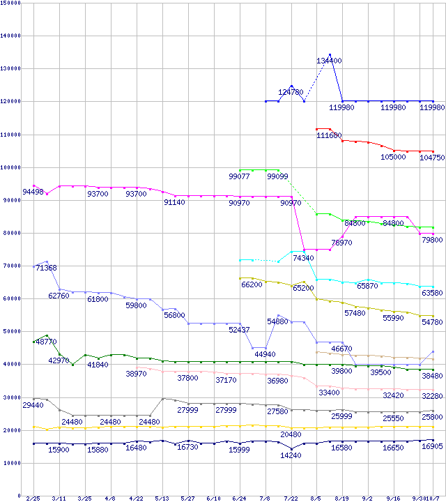 | Socket 939・FSB 1000MHzの最安値推移 | | | (2005年2月25日~2005年10月7日) |